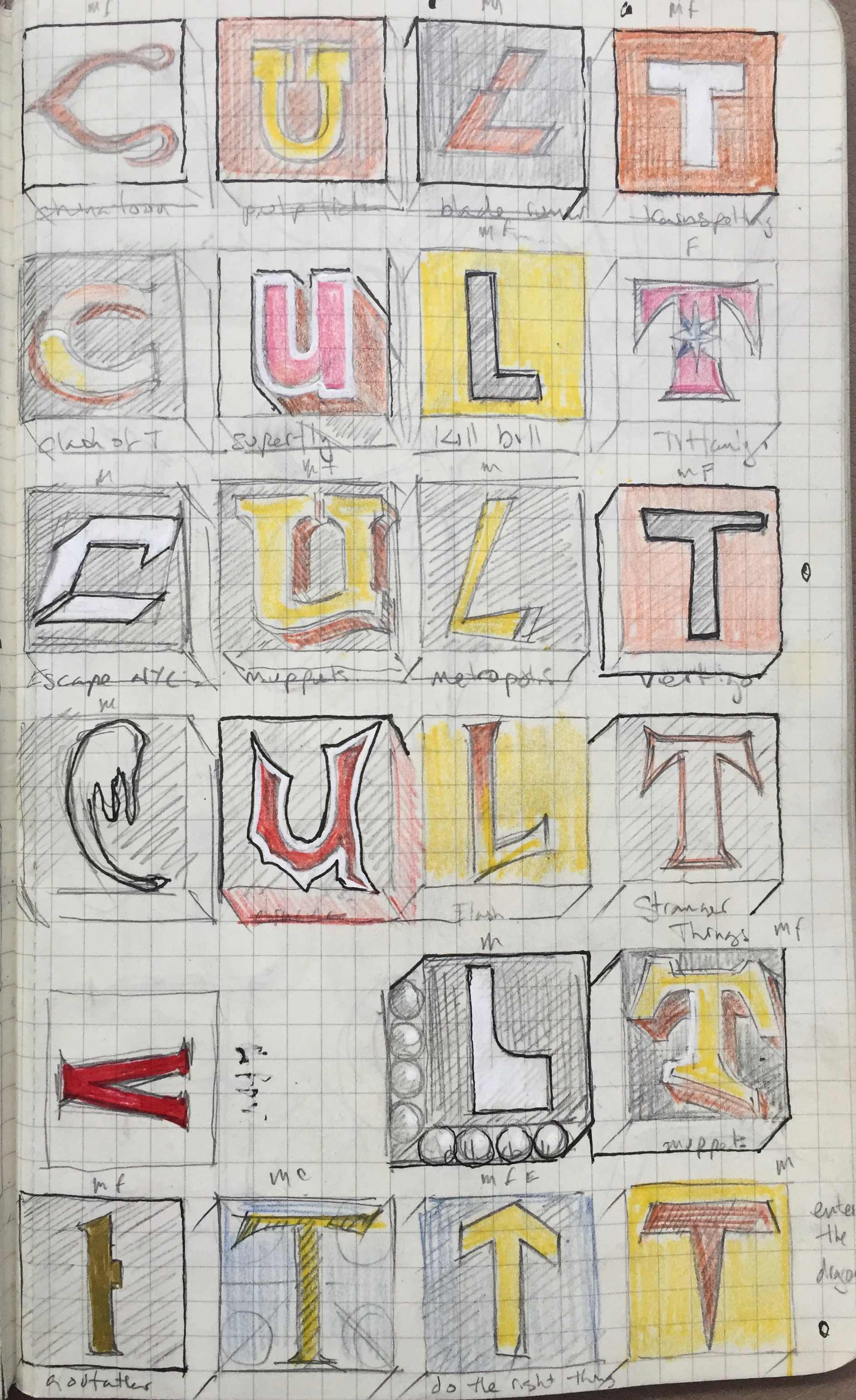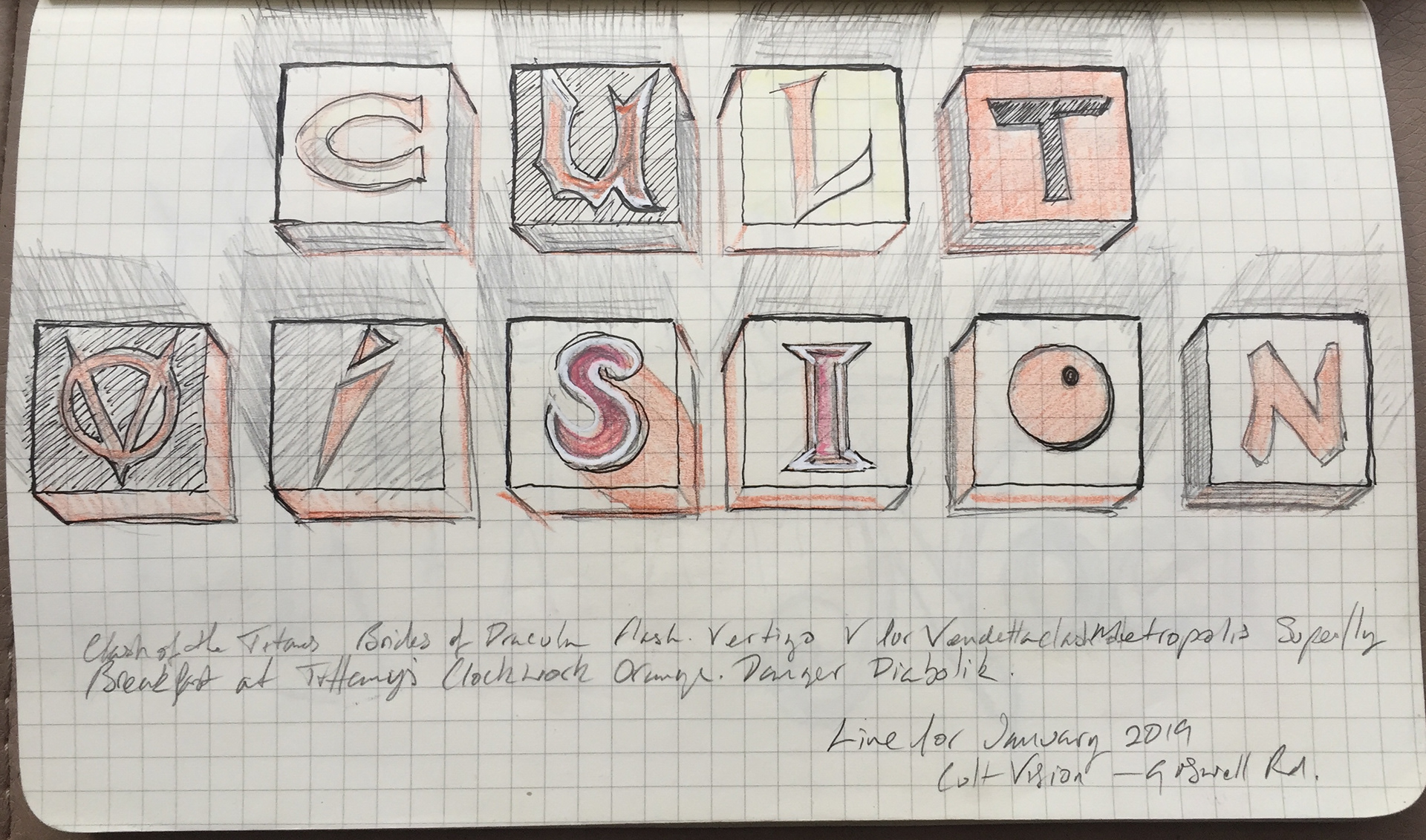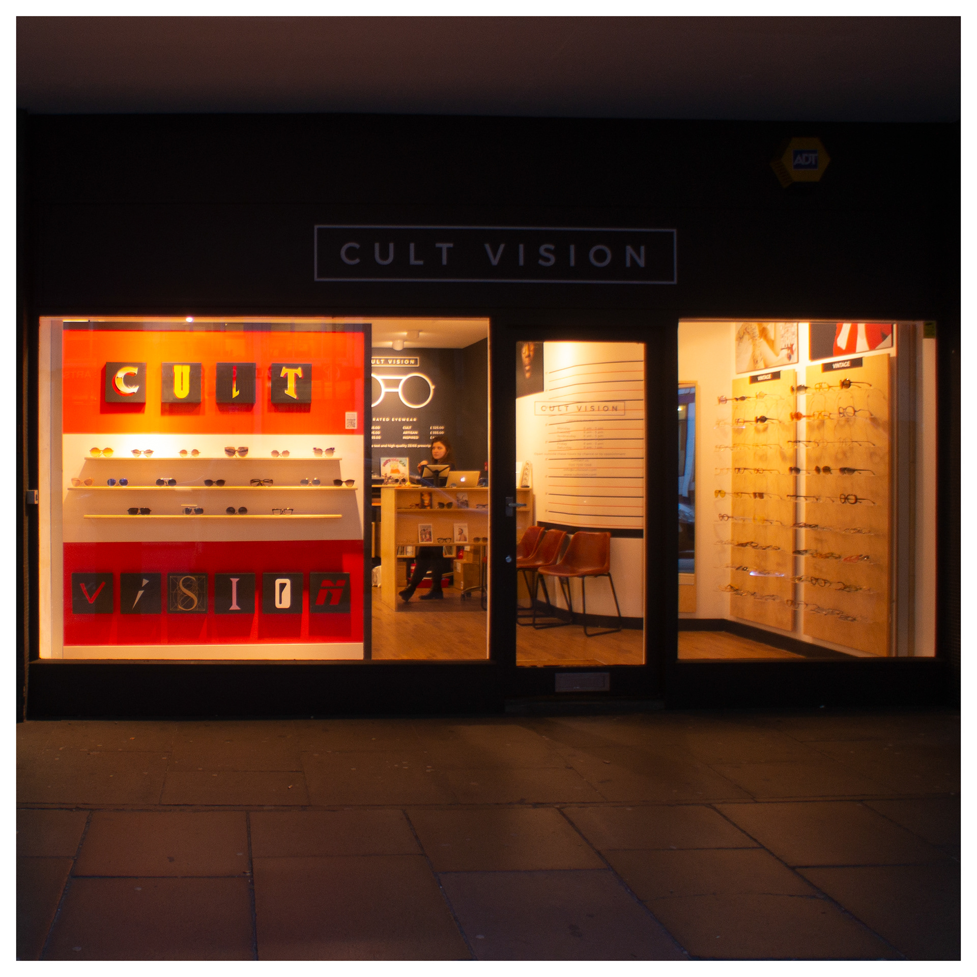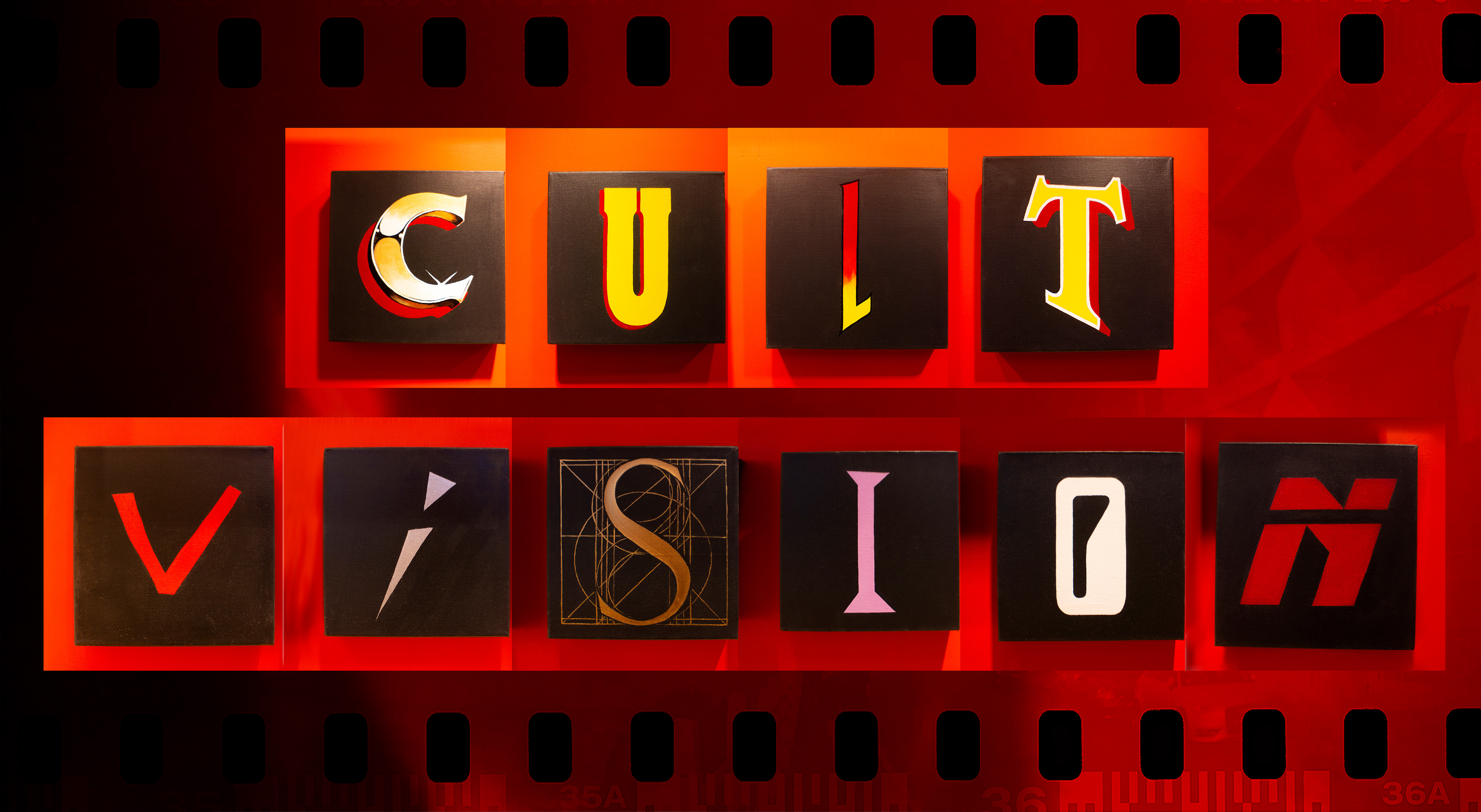 Hand painted letters derived from famous cult movies to promote Cult Vision optician on Goswell Road, London EC1.