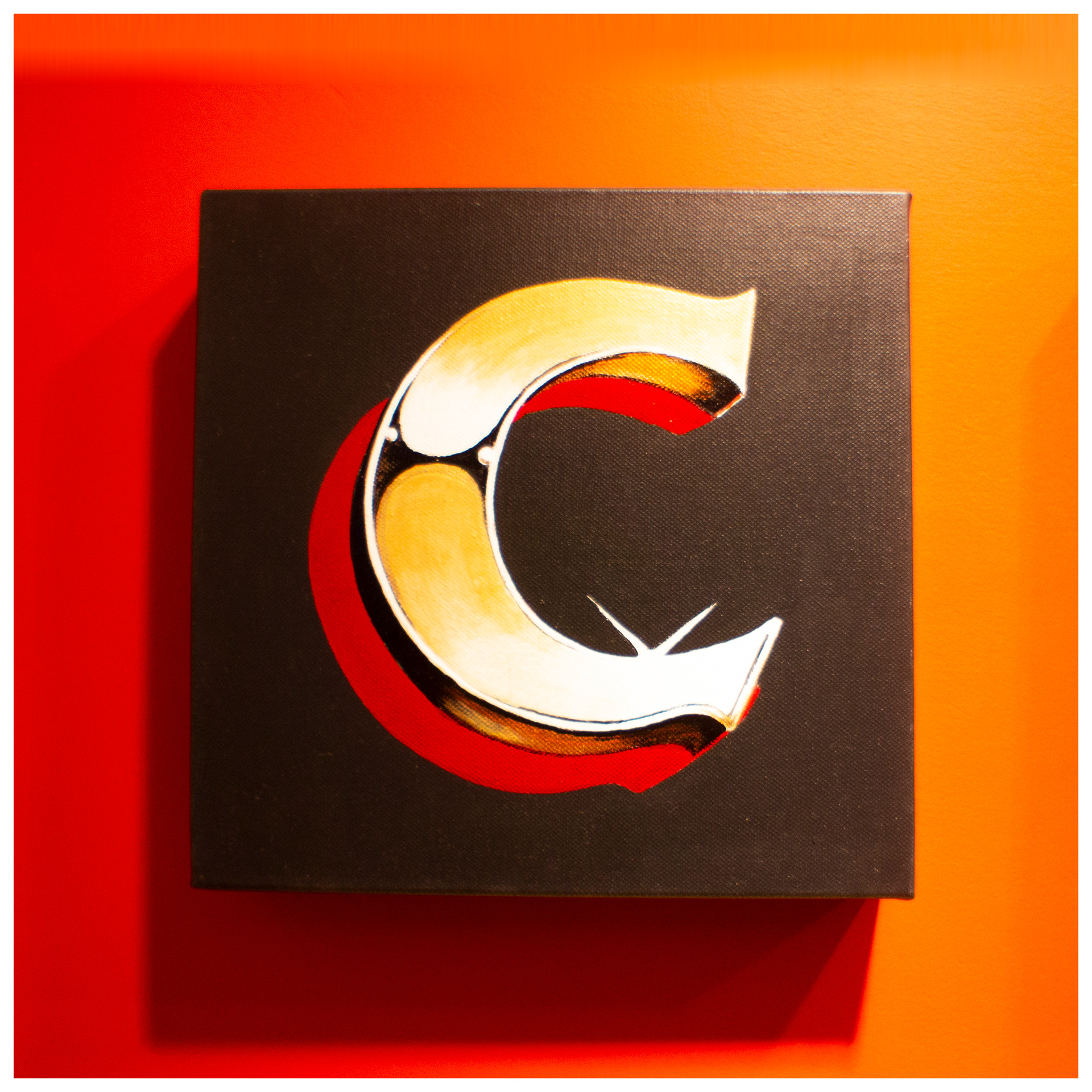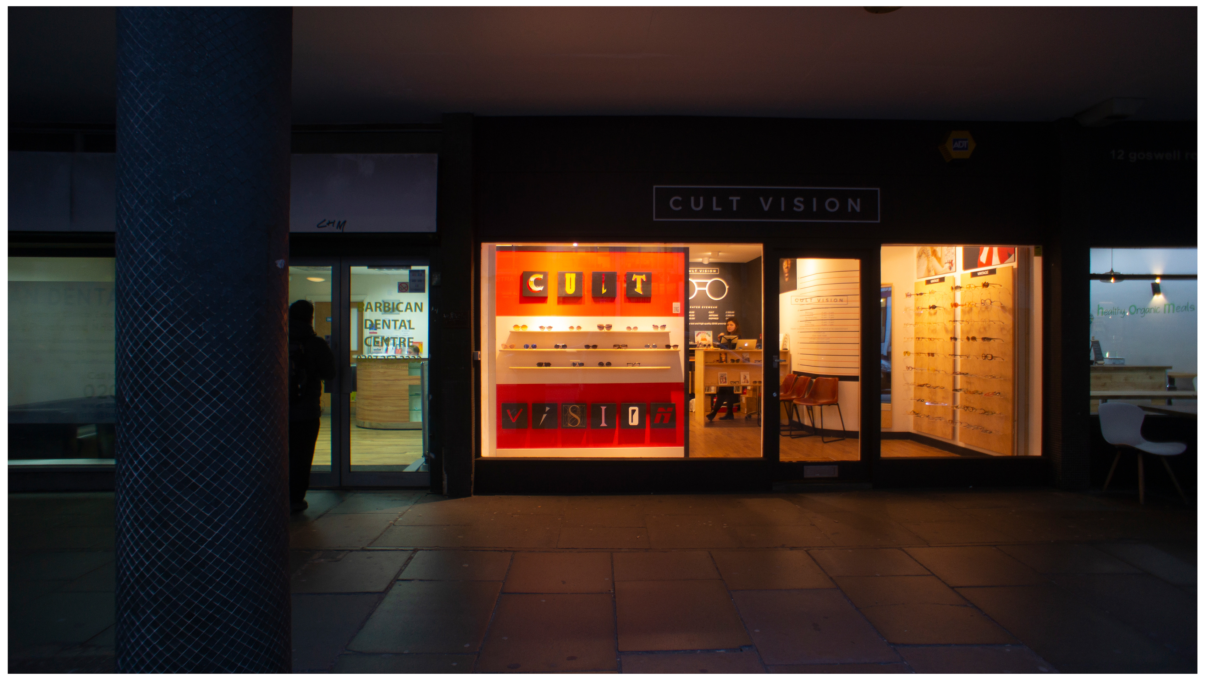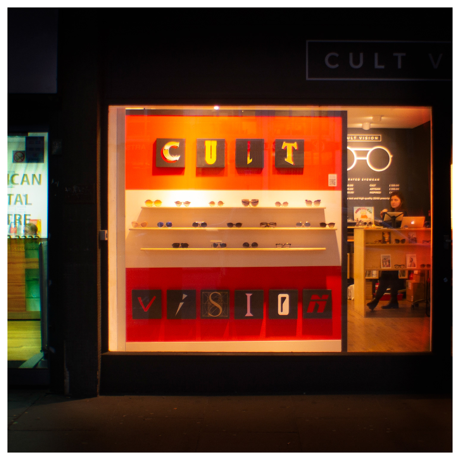 Hand painted letters derived from famous cult movies to promote "Cult Vision" opticians on Goswell Road, London EC1